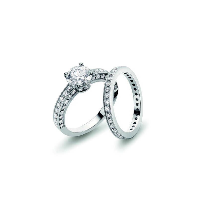 Roma Amor钻戒大器率性,以经典简约的四爪镶钻为主角,镶台结构侧面有部分镂空细节,让钻石更为通透纯净,戒圈另有铺镶钻石的设计选择。