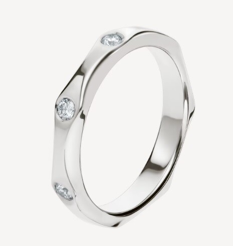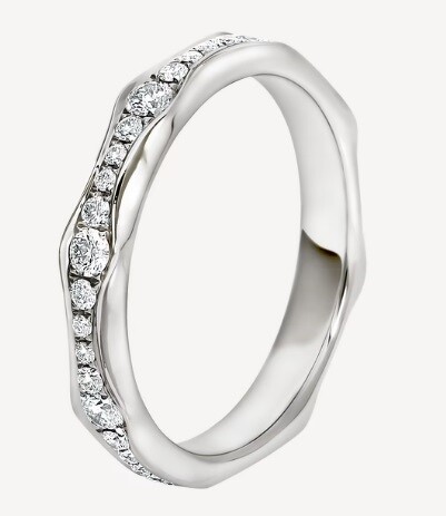 取义大利文之意,为设计注入丰饶与幸运的Spiga,辨识特色就是戒环上一稜一稜的造型,简单之中不失细腻变化,男女成对穿戴既甜蜜又时髦;杨谨华与老公的结婚对戒就是这款。